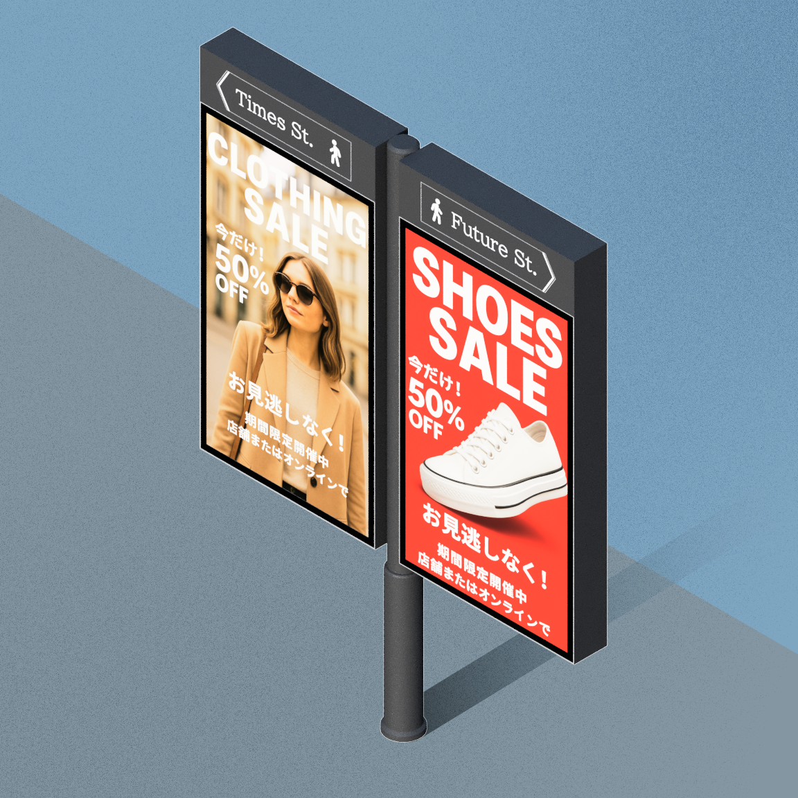 お持ちのデジタルサイネージ図面またはラフスケッチからから3Dモデルを作成しイメージ画像として出力します。角度はお好きな角度4種類となります。商品画像としてお使いください。